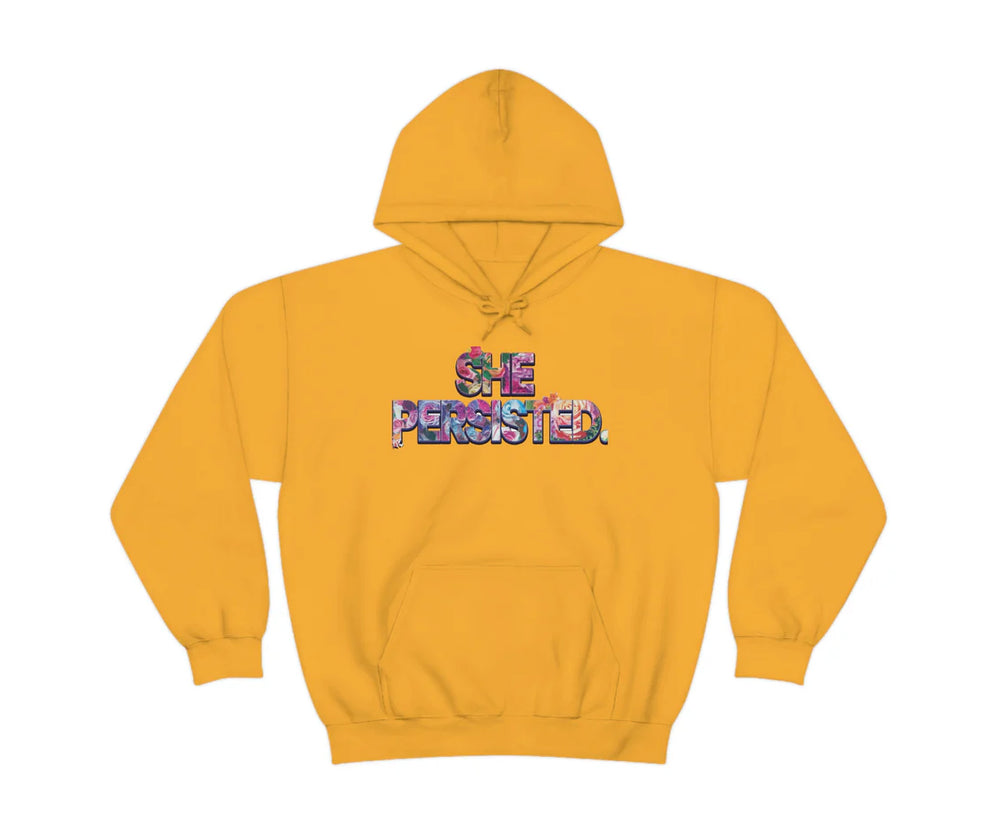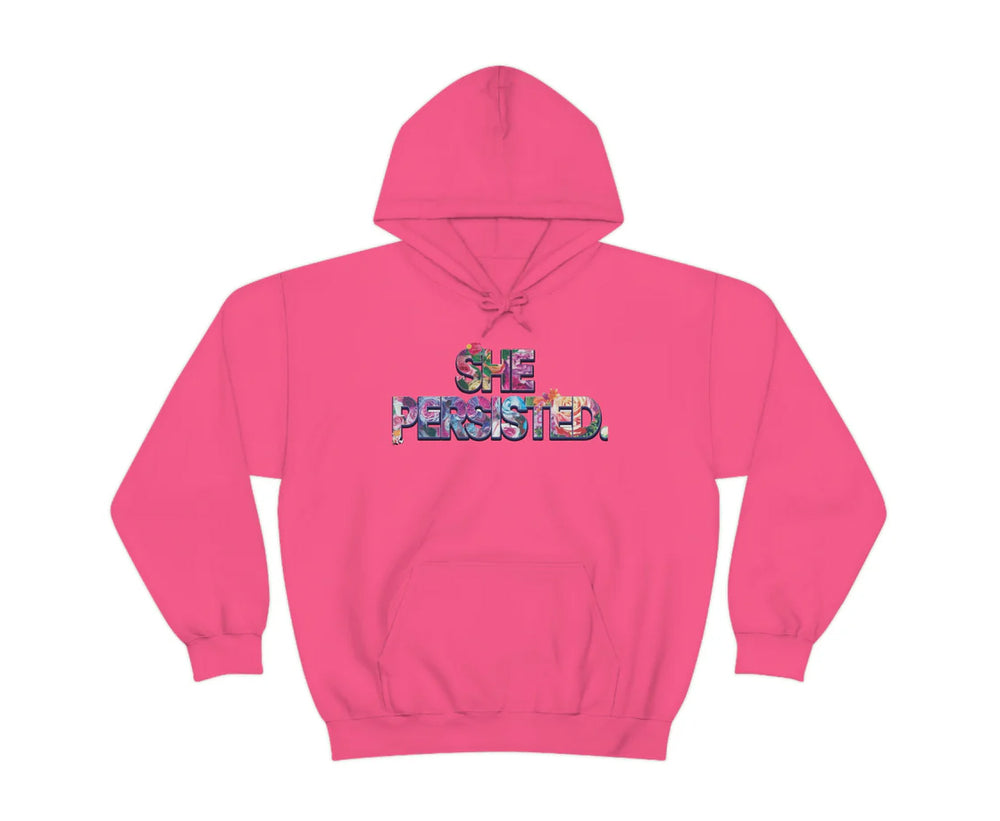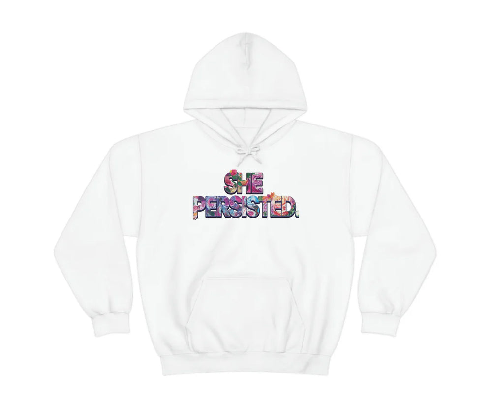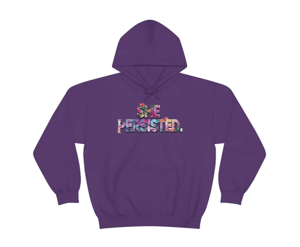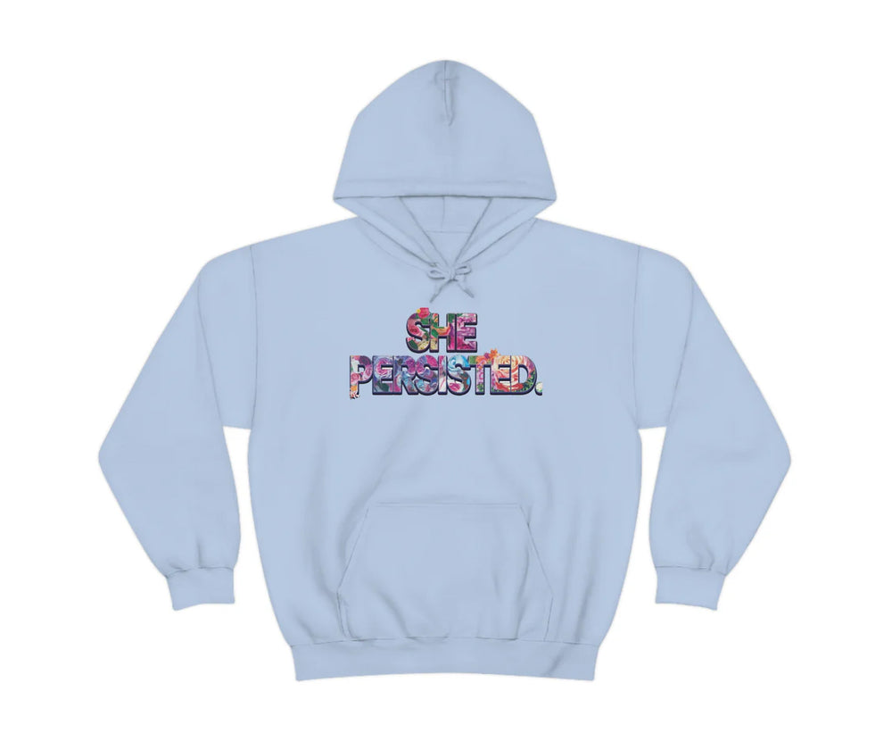 This unisex heavy blend hooded sweatshirt with "She Persisted" printed on it, is relaxation itself. Made with a thick blend of cotton and polyester, it feels plush, soft and warm, a perfect choice for any cold day while elevating women in your life. In the front, the spacious kangaroo pocket adds daily practicality while the hood's drawstring is the same color as the base sweater for extra style points. Available in 6 gorgeoys colors.